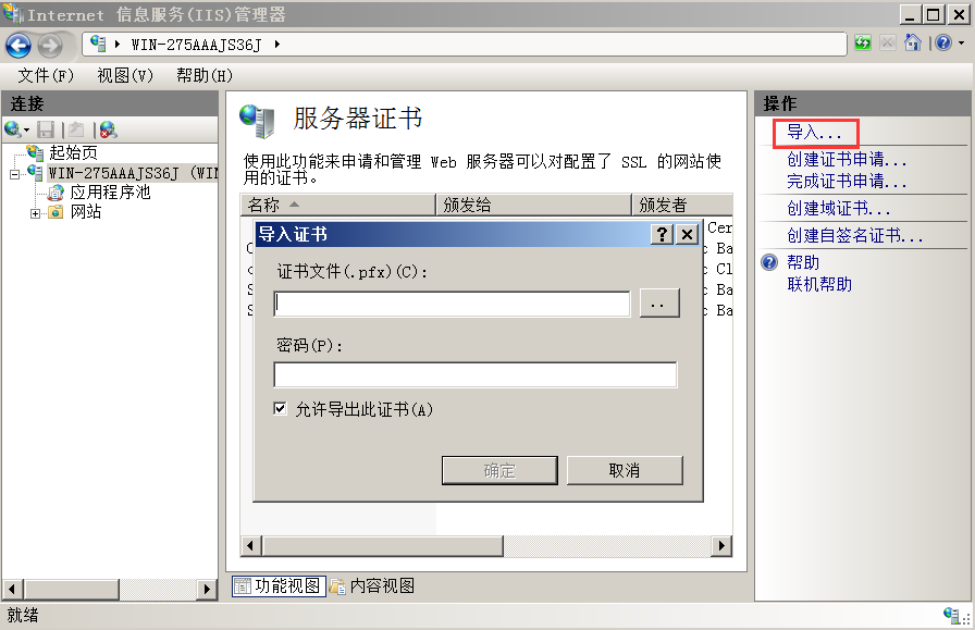 然后进入IIS管理控制台的服务器证书管理页面,右键选择“导入”