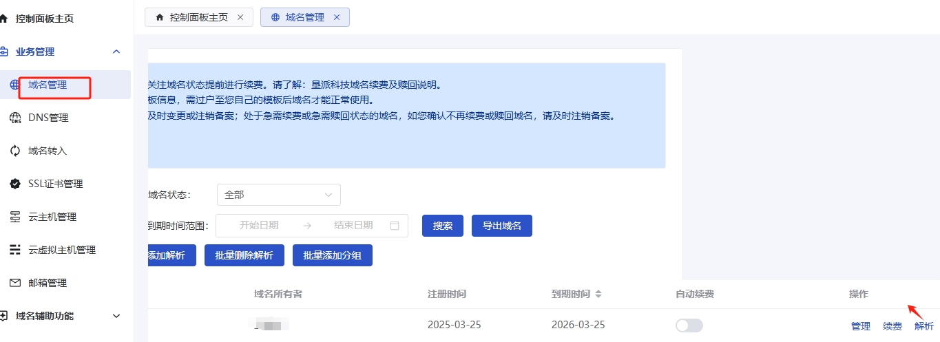 第一步:通过垦派科技官网会员中心进入到控制面板的域名管理,在域名后点击解析(如图所示)