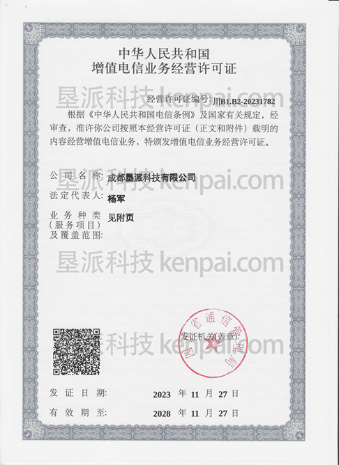 为更好的向用户提供完整的互联网基础资源服务,垦派科技于近日获得了省通信管理局颁发的增值电信经营许可(许可证号:川B1.B2-20231782)。